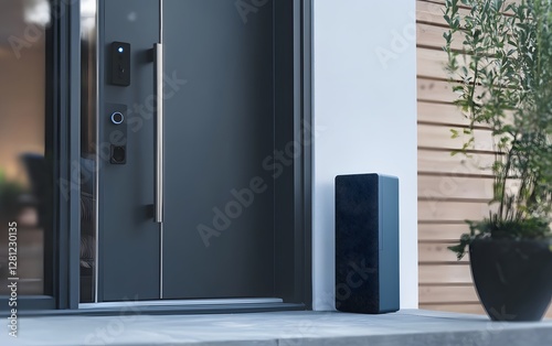 Fototapeta premium A modern entrance featuring a sleek smart speaker near a door. The stylish design harmonizes technology with home aesthetics, enhancing convenience and ambiance.