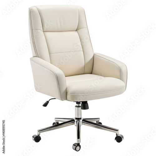 Naklejka premium A modern, ergonomic office chair in a light hue with plush upholstery and a five-point wheeled base for mobility.