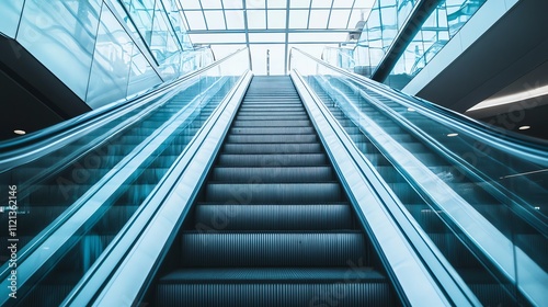 © Galib, Obraz premium A modern escalator leading upwards in a shopping mall with a glass ceiling.