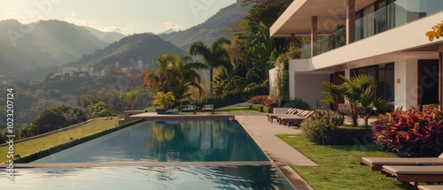 Fototapeta premium A modern estate with an infinity pool seamlessly blending into lush surroundings, mountain views creating a luxurious escape.