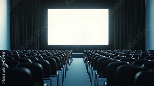 © Theeranan, Obraz premium A modern event hall setup with rows of chairs in front of a blank stage screen, ready for a presentation.