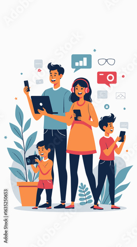 Obraz premium A modern family living in the digital era, with parents and children using their gadgets