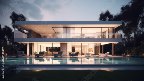 © Abdul Karim, Obraz premium A modern farmhouse-style home exterior at dusk
