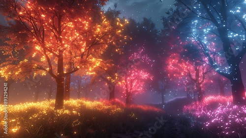 Naklejka premium A modern forest with interactive digital trees and neon-infused underbrush, creating an enchanting woodland scene