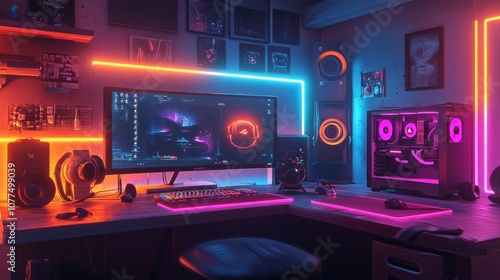 © Umi Sakina, Obraz premium A modern gaming setup with a computer, keyboard, mouse, headset, and speakers, all illuminated with colorful neon lights.