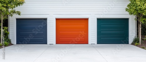 Fototapeta premium A modern garage with three doors: two in dark colors and one vibrant orange,...