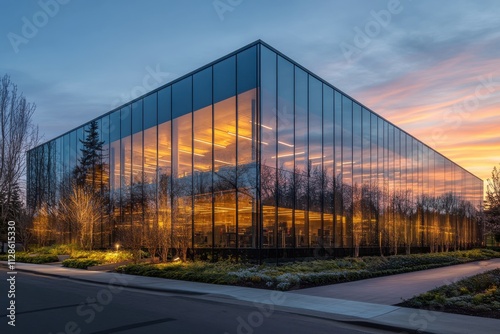 Fototapeta premium A modern glass office building with reflective windows illuminated by warm...