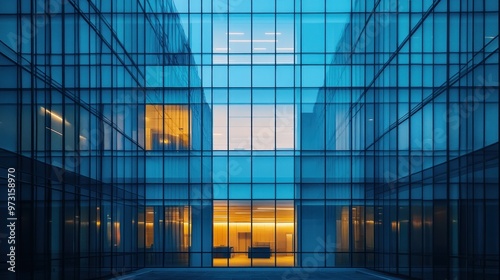 © BerkahStock, Fototapeta premium A modern glass structure reflecting light, creating a serene architectural space.