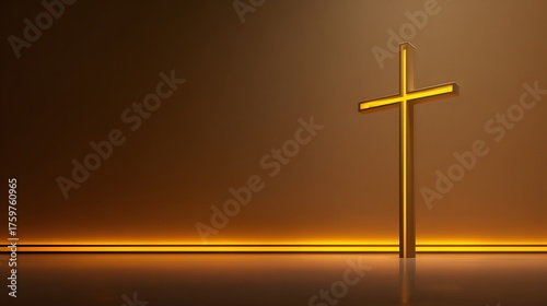 © kirania, Naklejka premium A modern golden cross glows with inner light in a dark setting.