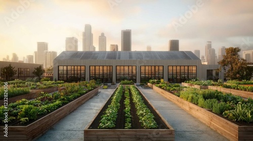 © Noppakun, Fototapeta premium A modern greenhouse surrounded by lush gardens, set against a city skyline at sunset, blending urban life with nature.