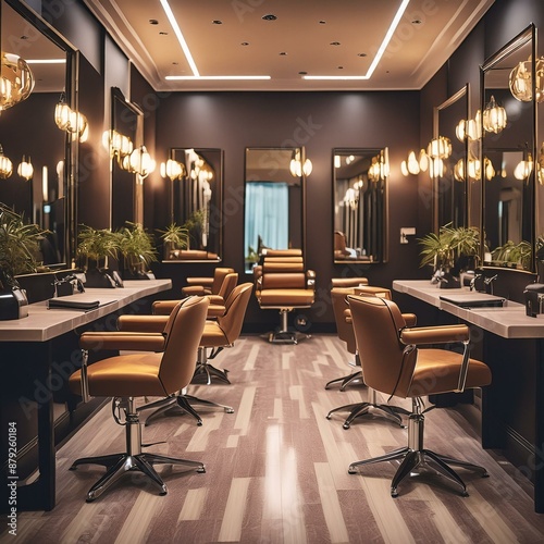 Obraz premium A modern hair salon interior with a row of comfortable chairs, large mirrors,...