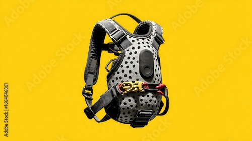 © Photographer, Naklejka premium A modern, high-tech safety harness for climbing or industrial work, isolated on a solid yellow background.