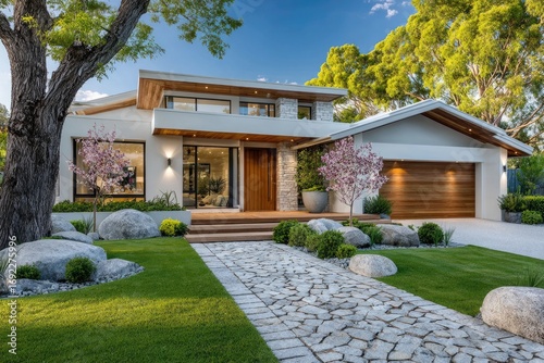 Naklejka premium a modern home in perth with a large front yard and grey accents, a white gate, green grass, and a blue sky