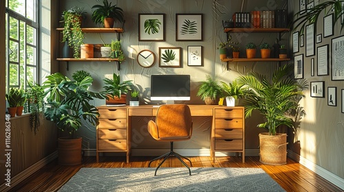 © Pattarin, Fototapeta premium A modern home office featuring a desk, computer, and chair, surrounded by lush indoor plants against a vibrant orange wall.