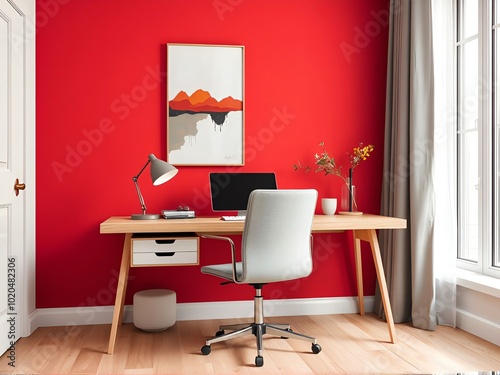 © Vectplus, Fototapeta premium A modern home office with a wooden desk against a vibrant red wall. The desk features a computer, a desk lamp, books, and a vase with flowers. A light gray chair sits in front, and landscape painting