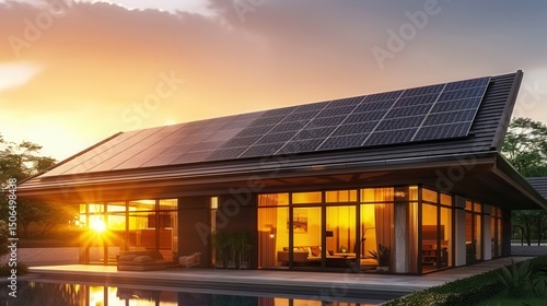 Obraz premium A modern home with solar panels on the roof during a vibrant sunset,...