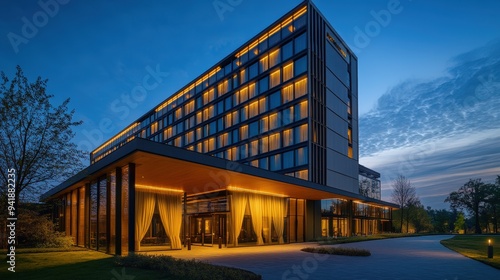 © Ishika, Fototapeta premium A modern hotel building with a large glass facade