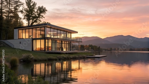 Fototapeta premium a modern house at sunset by the lake showcasing