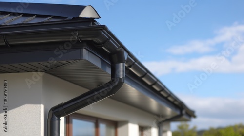 Fototapeta premium A modern house features a black roof and gutter system. The house is located...