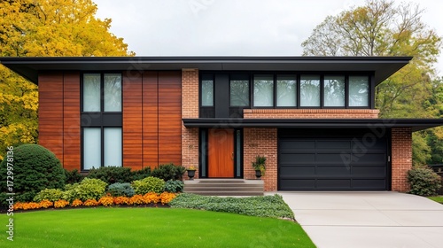 © Gentle Bunny, Obraz premium A modern house featuring a mix of wood and brick exteriors, surrounded by lush greenery and colorful landscaping.