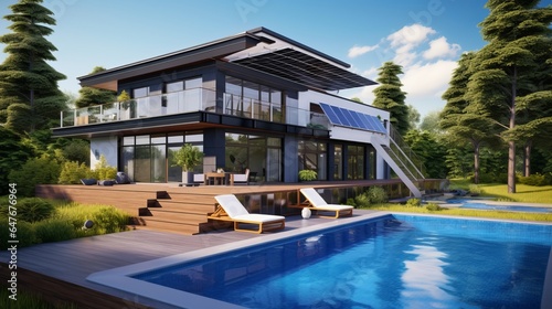 Fototapeta premium A modern house with a stylish pool and deck, showcasing exquisite interior...