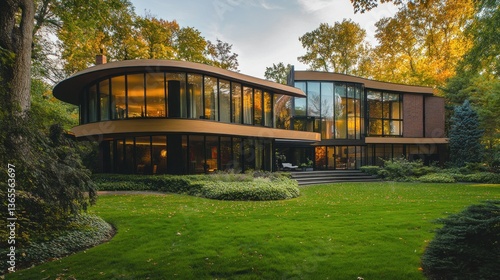 © Rizal, Fototapeta premium A modern house with a unique design and large windows surrounded by greenery