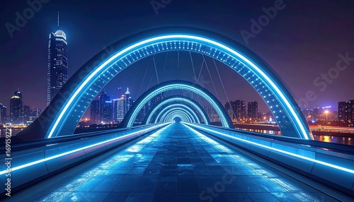 Fototapeta premium A modern, illuminated bridge spans a city at night, glowing with vibrant blue...