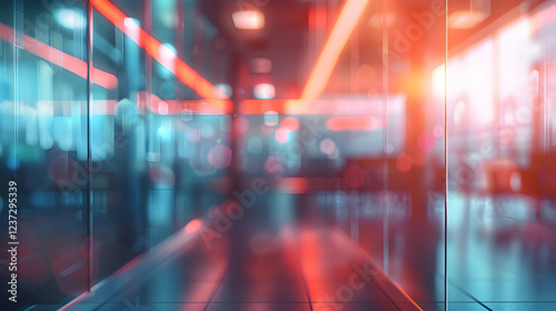 © rizkan, Fototapeta premium A modern, illuminated corridor with vibrant lighting and reflections.