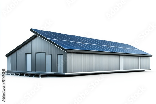 Fototapeta premium A modern industrial building featuring solar panel array on roof, showcasing...