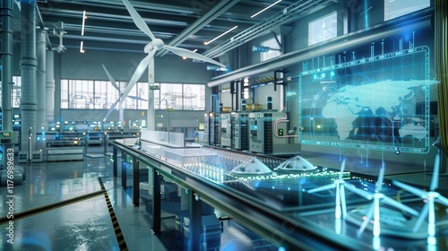 Fototapeta premium A modern industrial facility featuring wind turbines and advanced technology...