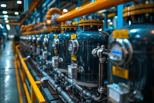 Fototapeta premium A modern industrial water filtration system with pressure gauges, pipes, and...