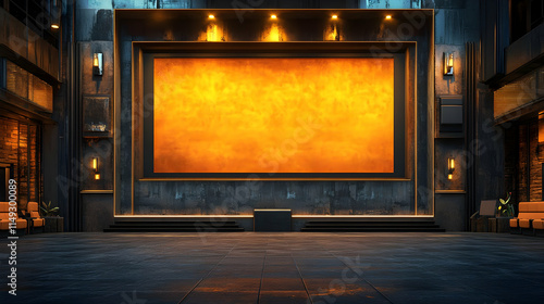 © SemangArt, Fototapeta premium A modern interior featuring a large illuminated orange display screen.