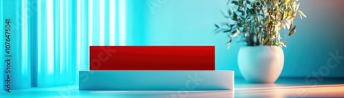 © tanapat, Fototapeta premium A modern interior scene featuring a red piece on a white platform, accented by soft blue light and a green plant in a decorative pot.