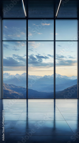 Fototapeta premium A modern interior with large windows showcasing a stunning mountain landscape...