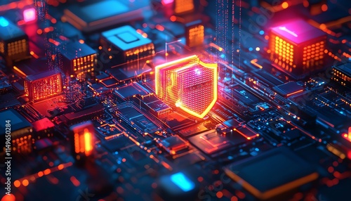 Fototapeta premium A modern IT security concept with a glowing shield, secure networks, and...