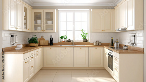 Fototapeta premium A modern kitchen designed with a warm beige and cream color palette, enhanced...