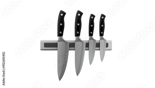 Obraz premium A modern kitchen magnetic knife strip securely holding four sharp,...