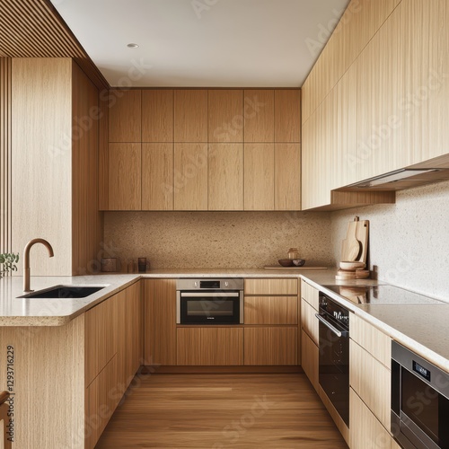 Fototapeta premium A modern kitchen with beautiful wooden cabinetry and details