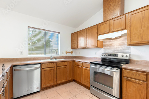 © Allison, Fototapeta premium A modern kitchen with stainless steel appliances and wooden cabinets