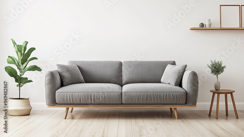 © Aul Stock, Fototapeta premium A modern living room featuring a gray sofa, plants, and minimal decor.