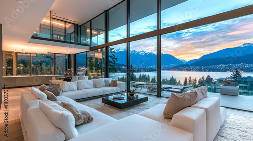 © Mahmud, Fototapeta premium A modern living room featuring a sleek white sofa positioned centrally on a soft white carpet, exudes elegance and minimalism.
