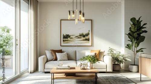 Fototapeta premium A modern living room with a cozy sofa, plants, and artwork, designed for...