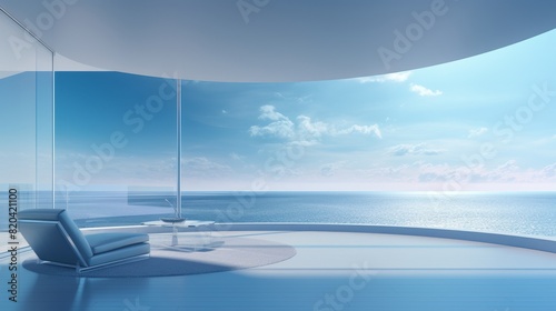 Fototapeta premium A modern living room with a large glass window looking out onto the ocean