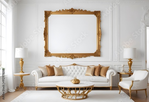Fototapeta premium A modern living room with a large gray sectional sofa, a wooden framed wall...