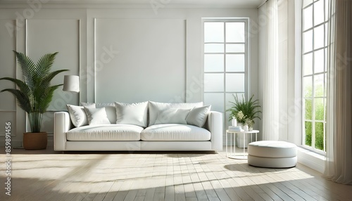 Fototapeta premium A modern living room with a white couch and a large window, ample copy space, bright and minimalistic background.