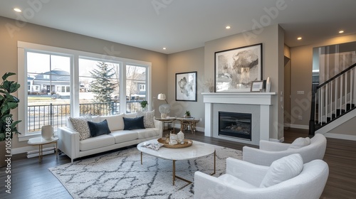 Fototapeta premium A modern living room with a white couch, two white armchairs, a coffee table, a fireplace, a rug, and a large window.