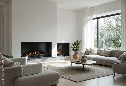 Fototapeta premium A modern living room with two fireplaces and large windows.
