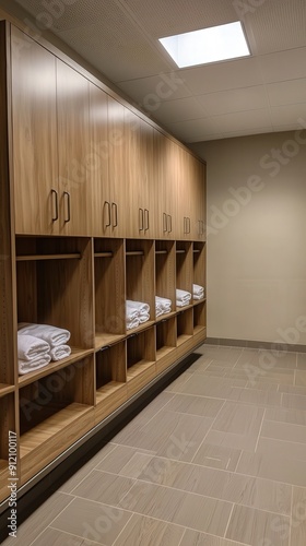 Fototapeta premium A modern locker room with sleek wooden cabinets and neatly folded towels,...