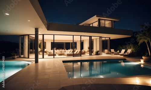 Fototapeta premium A modern luxury villa with a swimming pool and outdoor lounge area at night....