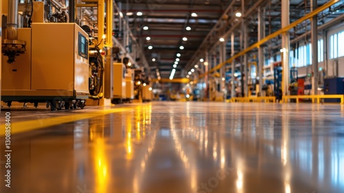 Fototapeta premium A modern manufacturing facility features advanced machinery aligned along yellow marked lanes
